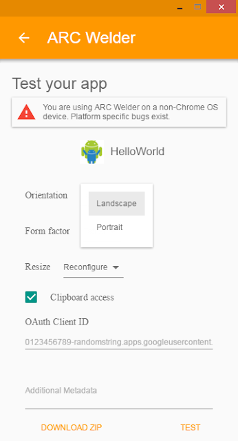 Those of you using ARC Welder to test apps may have noticed a problem with "invisible dropdowns" when trying to set the recommended Orientation (Portrait) and Form Factor (Phone) on first use. As shown below, the triangle points upward when the selector is clicked, but the dropdown is not visible.